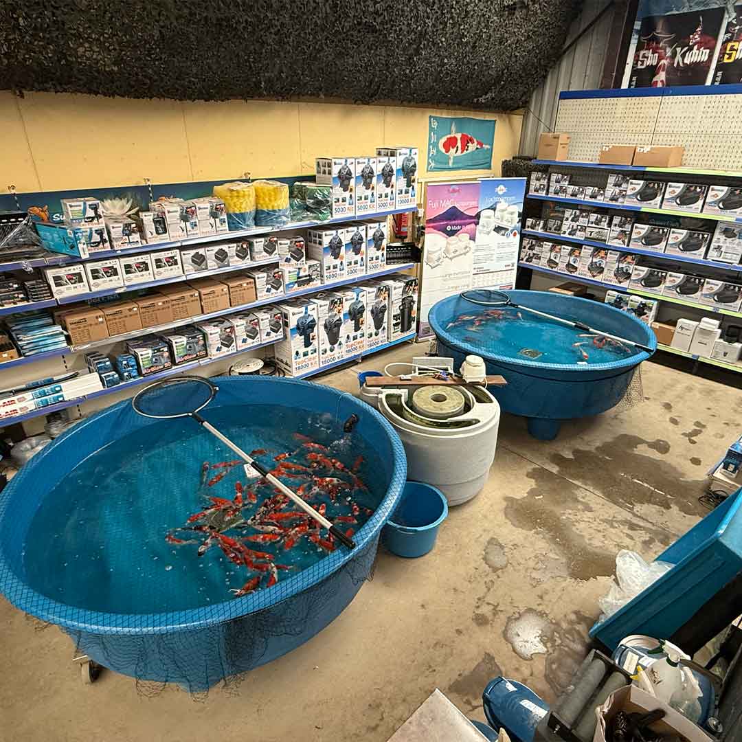 Dankzij deze directe inkoop aan de bron kunnen we onze winkel het hele jaar voorzien van een sterke en gevarieerde selectie koi, in uiteenlopende variëteiten, maten en prijsklassen. Of je nu zoekt naar een jonge tosai, een grotere nisai of een specifieke variëteit: de kans is groot dat er iets bijzonders voor je rondzwemt.